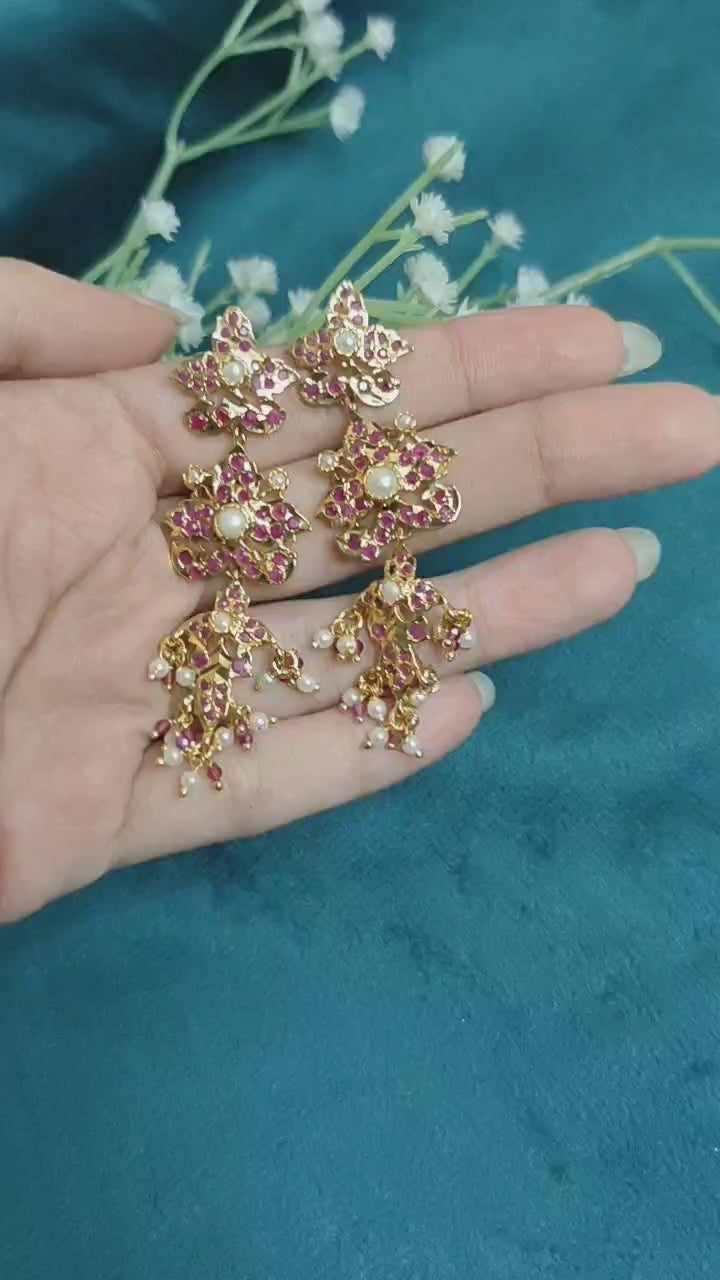 Enhance your festive look with these floral designer long jadau gold plated navratna earrings. Adorned with vibrant navratna stones and intricate floral motifs, this elegant pair blends regal charm with timeless tradition — perfect for celebrations and special occasions.