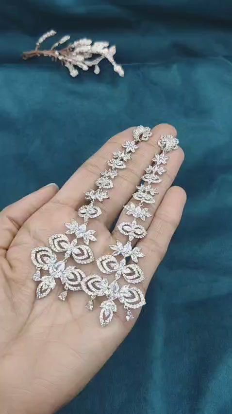 These mind-blowing long chandelier earrings are skillfully silver plated and have a stunning combination of high-quality cubic zircon stones and marquise-cut stones. The intricate look of these long chandelier Earrings features a light floral or teardrop stud that goes on to form tiered strands to create a stunning waterfall effect with every movement of the earrings. Long Chandelier Earrings are perfect to wear during a reception or a party event that demands a touch of royalty with it.