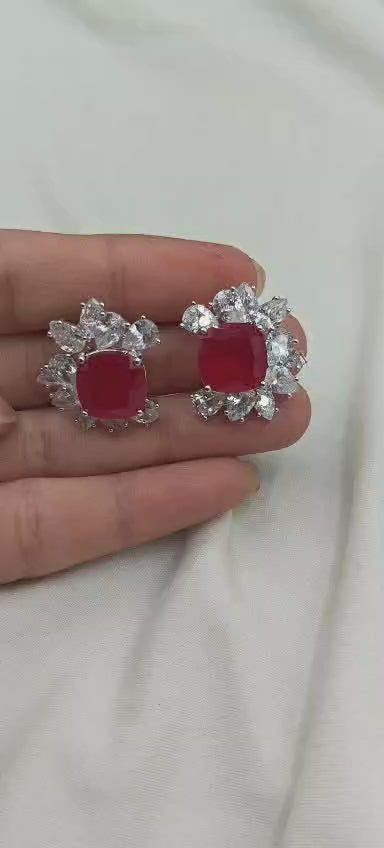 Floral Style Silver Plated Ruby And Drop Shape Diamond Stud Earrings For Women