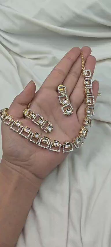 Geometric Square Kundan & Cubic Zircon Dual Tone Adjustable Short Necklace