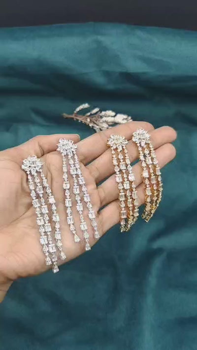 Spice up your evening look with these gorgeous gold-plated long earrings that boast a fabulous fusion of sparkling cubic zircon and expertly cut marquise and baguette-cut stones. This design highlights a very elegant floral motif stud that smoothly blends into cascading triple-strand drops that exude a sense of dynamic movement. Ideal for the most special occasions such as weddings and formal galas, these shoulder-grazing earrings will give you the bright brilliance of diamonds in a very polished finish.