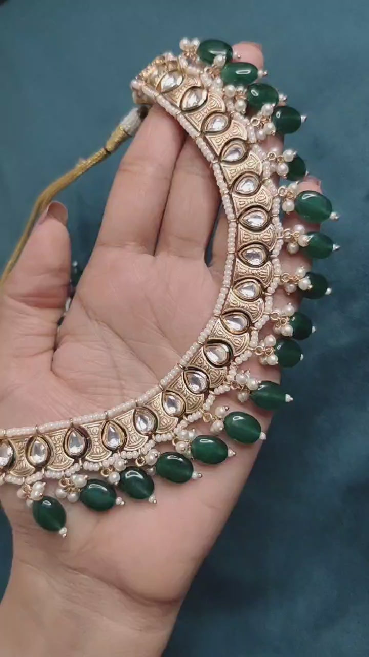 Gold Plated Dark Green Beads And White Pearl Kundan Short Necklace Set