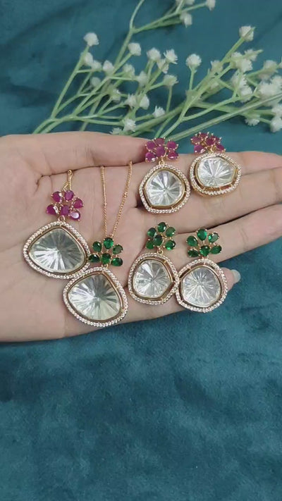 Exquisitely designed, this gold-plated jewelry set comprises a statement pendant and matching earrings, both bedecked with an unique fan-cut kundan center, framed eloquently with a halo of sparkling cubic zircon. The design is uplifted with an inching floral motif available in emerald green, deep sapphire blue, or ruby pink stones, thus giving the ensemble a sophisticated pop of color. Accompanied by a delicate gold-toned chain, this versatile set seamlessly blends traditional craftsmanship with modern luxury, hence becoming apt for party, festive celebrations, or formal events.