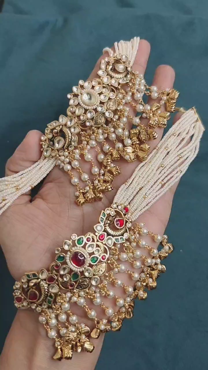 A Gold-Plated Kundan with Pearl Moti Setting Choker Necklaces Set is a beautiful piece of traditional Indian jewelry that combines the elegance of pearls with the intricate details of Kundan work. This set typically includes a choker necklace, a pair of earrings,