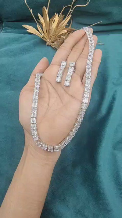 Make a timeless fashion statement with this silver-plated short necklace set, boasting a breathtaking assortment of brilliant, square-cut diamonds. This sleek and modern design boasts a luxurious tennis-style look that is perfectly complemented by a pair of matching drop earrings for a cohesive and elegant look. This exquisite necklace set is the perfect fashion statement for weddings, formal events, or high-fashion nights out.
