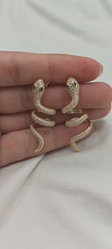 Green Eyed Snake Motif Cubic Zircon Gold Plated Stud Earrings