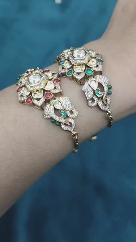 The sophisticated elegance, affordability, and ancestral charm of this antique gold-toned bracelet are enhanced by the intricate flower detail at its centre. The flower has sparkling cubic zircon and beautiful kemp stones set in it. The lantern design is enhanced with traditional kundan technique and beautiful peacock detailing that extends down the full length of the chain. A fully adjustable sliding clasp provides you with a custom fit. Overall, this stunning bracelet can be worn on any occasion, no matter how special or formal.
