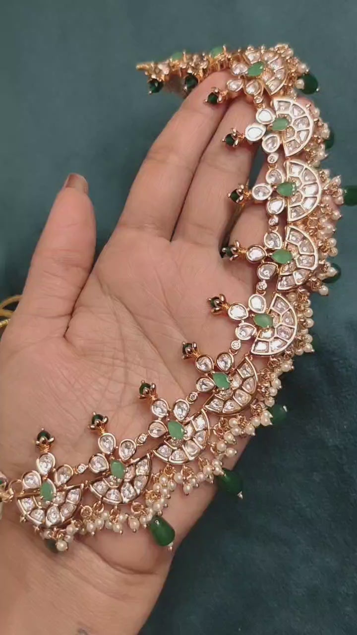 Woven in with the kundan pattern are the green beads, which may be of glass, jade, or other semi precious gems. The green beads provide a splash of color to the necklace and make for a contrasting visual effect with the gold or metallic foundation and the white or colored kundan stones.