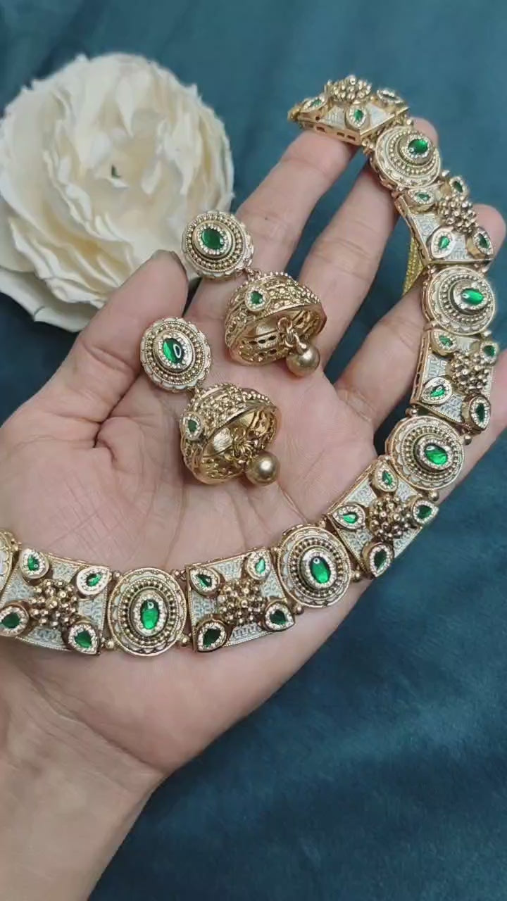 Kundan Meenakari Antique Gold Emerald Traditional Necklace Set
