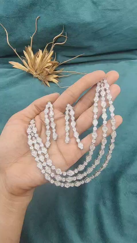 This silver-plated jewelry set boasts an awe-inspiring triple-layered necklace design, carefully encrusted with sparkling cubic zircon stones in alternating round and marquise cuts. The cascading design exudes a luxurious draped effect that flawlessly frames the neckline, accompanied by a pair of triple-drop earrings for a complete high-glam look. Secured with a reliable box clasp, this jewelry set is an exquisite choice for brides, formal events, or any occasion that demands a touch of royalty.