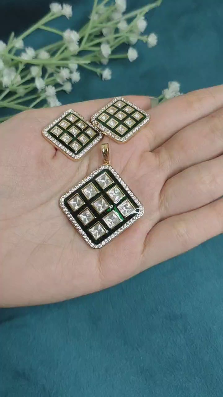 The meenakari square kundan pendant set is crafted in a striking square shape, meticulously designed to reflect the geometric precision and timeless elegance of traditional Indian art. Its bold silhouette serves as a captivating centerpiece.