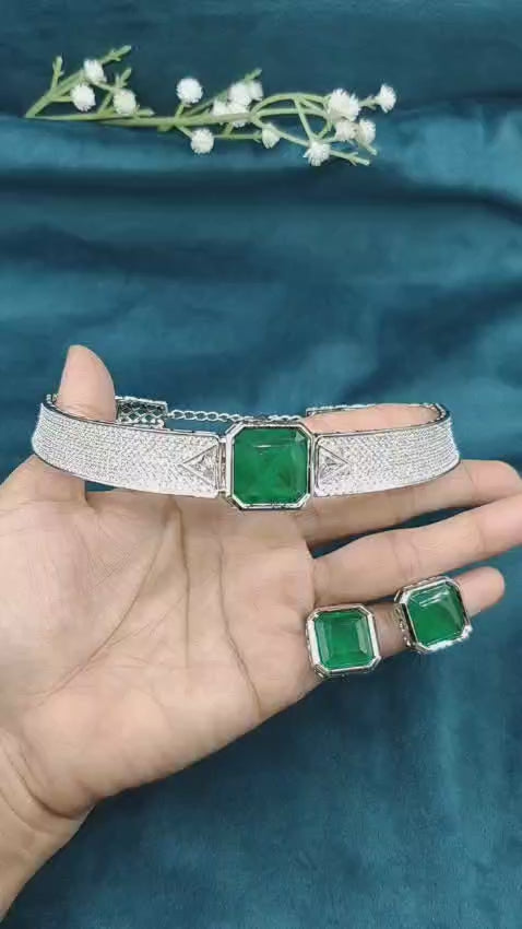Modern Geometric Green Emerald Cubic Zircon Silver Plated Choker Necklace Set