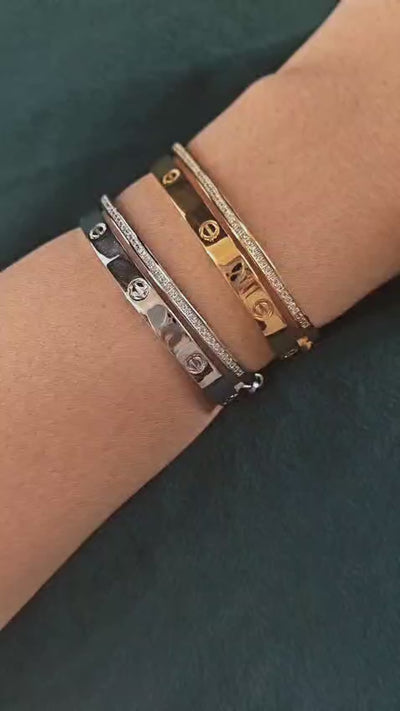 This trendy adjustable kada style bracelet boasts a modern two-band design with a sleek combination of silver-plated polished metal and parallel rows of sparkling pavé-cut cubic zircon. The modern design features subtle screw head details for a high-end industrial-chic look that can be dressed up or down for daytime wear or evening occasions. The adjustable design features a chain extender for a secure closure.