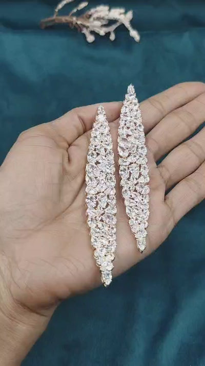 Enhance your evening outfit with these breathtaking long drop earrings, boasting an elegant tapered shape intricately pavé set with high brillance stones. This designer piece boasts an eye-catching architectural shape with an elegant mosaic of pear and round-cut diamonds, serving to reflect light from every direction to produce an amazing luminous effect. Complete with an exclusive gold-tone setting, this designer piece provides the perfect fusion of modern sophistication and timeless poise for the fashion-conscious jewelry accessory enthusiast.