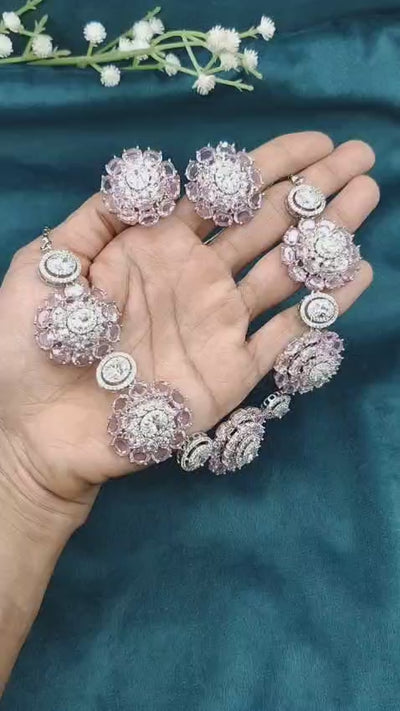 Pastel Pink Traditional Floral Design Silver Plated Diamond Choker Necklace Set