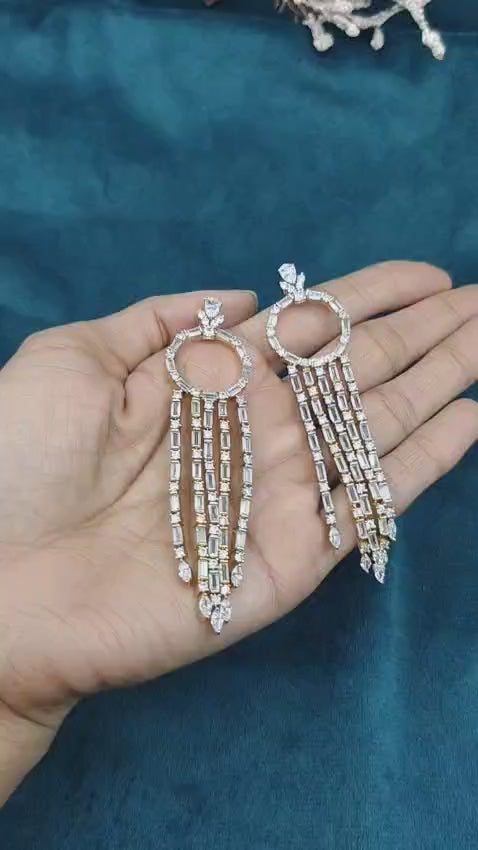 Add an extra edge to your style statement with these elegant dual-toned earrings, featuring a striking blend of gold and silver plating for versatility with an essentially modern look. The design features a shimmy circular stud that leads into cascading tassels of baguette-and-marquise-cut crystals, adding fluid movement and brilliant sparkle. Perfect for adding modern glamour to your festive wardrobe, these long-drop earrings are versatile and can be paired with both traditional and western wear.