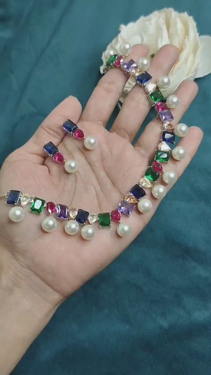 Silver-Plated Multi Colored Pearl Cubic Zircon Short Necklace Set