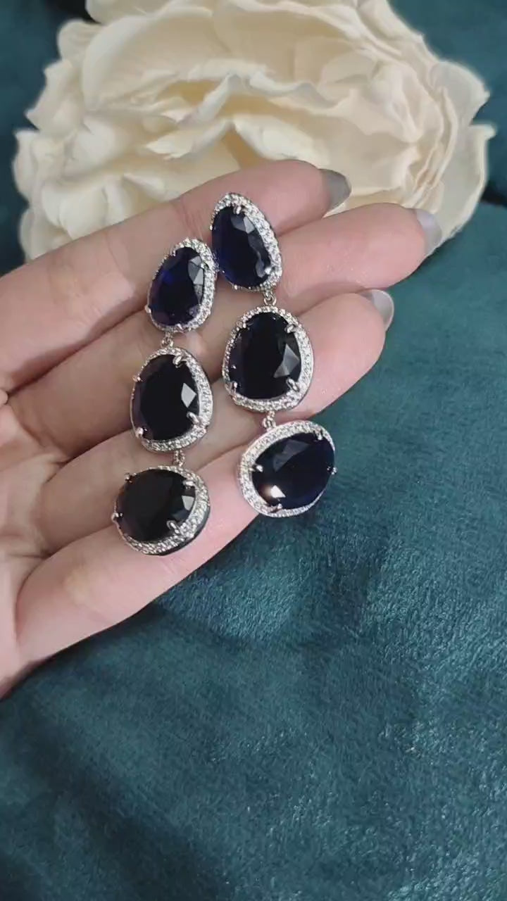 Silver Diamond Sapphire Stone Long Dangle Earring