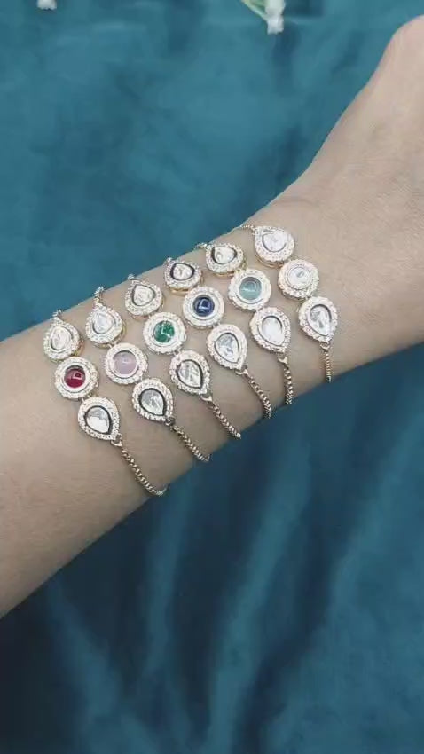Wear this gold-polished flexible charm bracelet flat against your skin, made with cubic zircon charms and kemp chain charms in three shapes of brilliant teardrop and round settings. The delicate design features a colorful gemstone center encircled with a halo of finely polished kundan-style accents, and is available in beautiful royal colours such as emerald green, ruby red and blue sapphire. This elegant bracelet is ideal for everyday wear or stacking with other bracelets. Finished with a smooth, adjustable slide chain, you can be sure it will fit any wrist securely with its comfortable and custom fit.