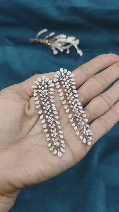Shake up your evening wear with these gorgeous silver-plated long earrings that feature intricate craftsmanship in the form of cubic zircon stones that shimmer like diamonds. The elegant design includes pear-shaped stones that dangle from the earrings in an artistic manner that resembles a tree branch, giving the earrings an elegant and long shape that is simply stunning when seen from every angle in the light of the room.