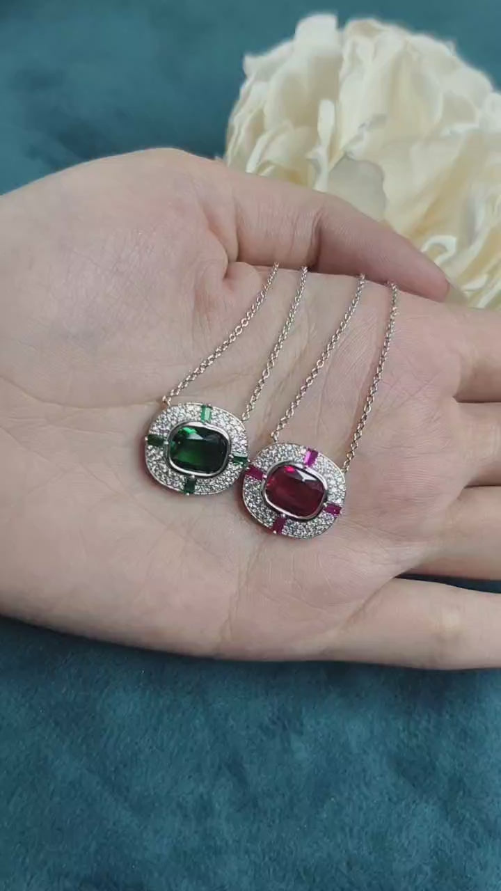 Square Cut Ruby And Green Silver Plated Pendant Set