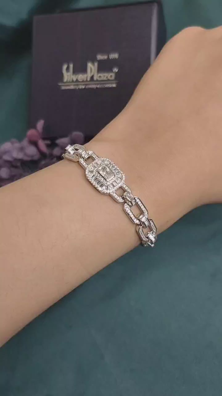 This square link style women’s loose bracelet features shimmering cubic zirconia stones, set in a modern geometric design. Its bold yet elegant style adds a contemporary touch to any outfit, perfect for both day and evening wear.