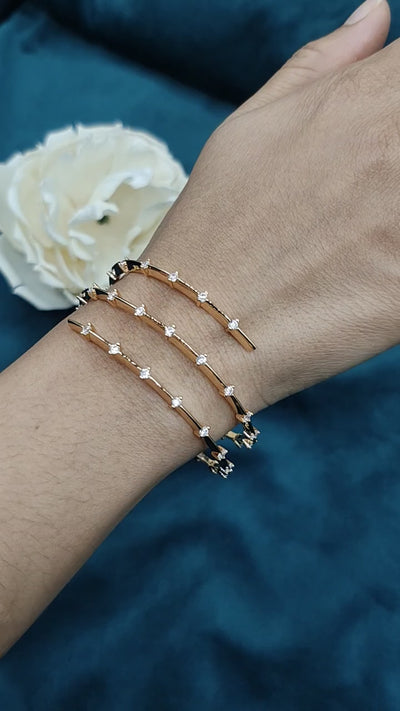 This gorgeous gold-plated kada bangle boasts a modern triple-coil design that will add instant modern glamour to any outfit. Delicate sparkling cubic zircon stones line the edgy, textured band, catching the light with movement. Adjustable and sophisticated, this piece makes a luxurious statement whether it's worn alone or stacked with other bracelets.