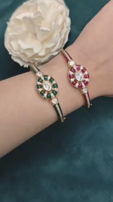 Make a striking statement with this exquisite gold-plated kada. The beautiful central design showcases a sparkling Kundan stone surrounded by vibrant ruby-red and emerald-green zircon accents. Its openable mechanism ensures easy wear, while the rich color contrast adds a touch of royal luxury to any ethnic or festive outfit.