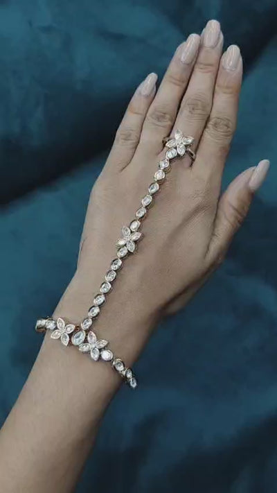 Make a stunning statement with this spectacular kundan haath phool, truly a masterpiece for your hand. The poised placement of kundans catches and reflects light, giving unparalleled sparkle against the unique rich carat polish setting. Its clever adjustable design makes it easily wearable and a perfect fit for any wearer. This is the definitive access
