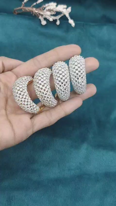 These elegant bali hoop earrings have a very statement-like crescent-shaped design that is delicately paved with a luxurious cosmetic of top-quality cubic zircon stones. These elegant bali hoop earrings are rendered in both golden and silver plating options that feature a very visually appealing lattice work on the inside of these bali hoops that ascertain a very light feel irrespective of their very plush and full-like silhouette. These elegant bali hoop earrings are thoroughly competent in combining traditional designs with a very modern touch of sparkle that surely accentuates its very use as a very versatile statement piece.
