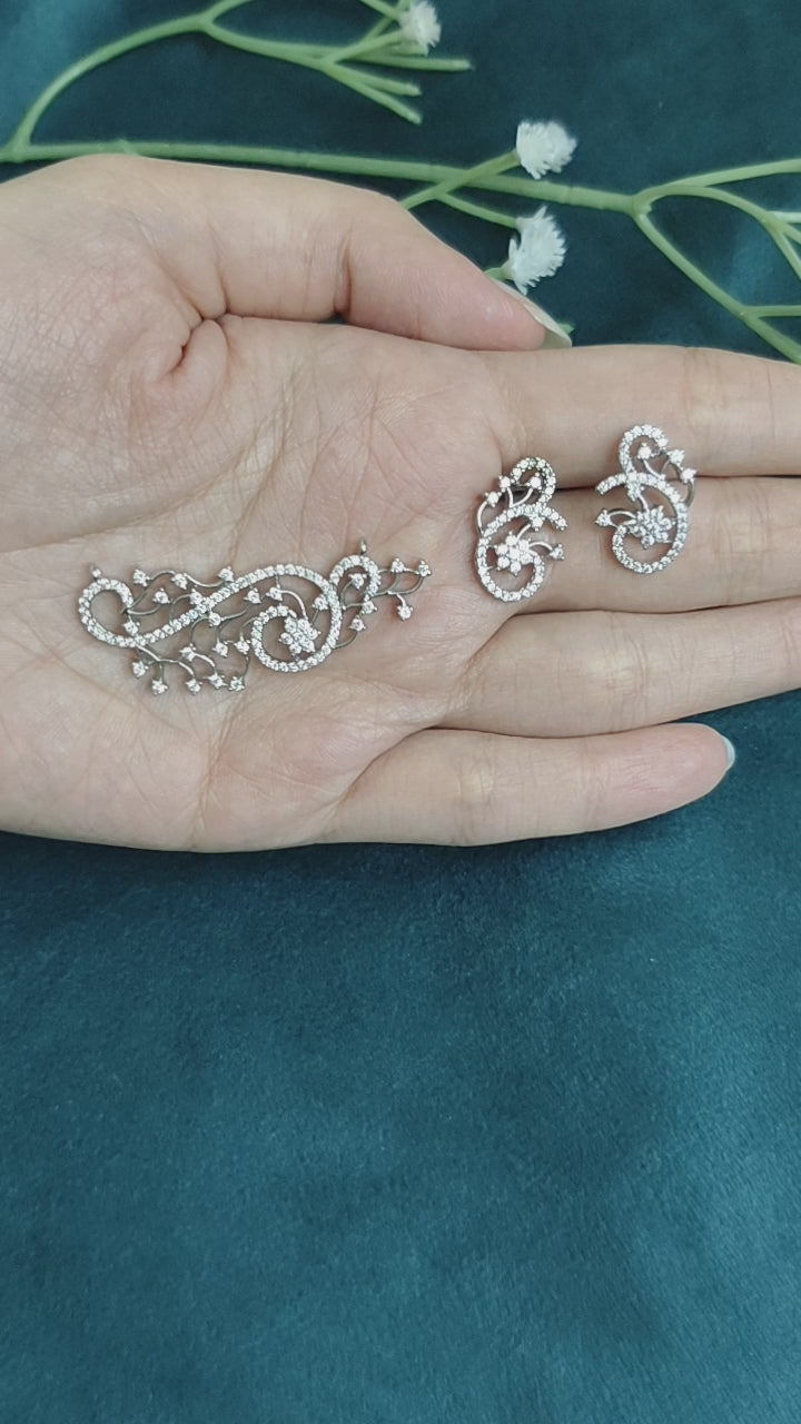 Gracefully designed, this delicate flower and cubic zircon mangalsutra pendant set blends floral beauty with timeless tradition. The dainty flower motif, accented with sparkling cubic zircon stones, adds a soft elegance to everyday wear. Complete with matching earrings, it's a perfect symbol of love, commitment, and refined style.