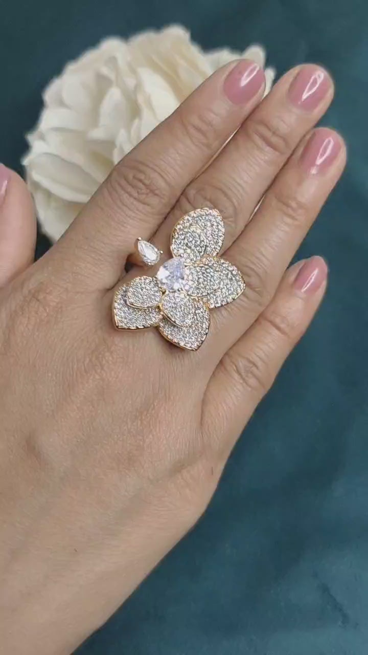 Gracefully modern, this unique half petal design adjustable finger ring features an elegant open petal motif, finished in radiant gold plating. Its minimal yet artistic look makes it a perfect accessory for everyday elegance or a subtle festive charm.