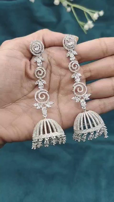 Make a dramatic entrance with these spectacular long Jhumka earrings, made in a brilliant silver polish finish and heavily embellished with glittering cubic zircon and marquise stones. The unique layered design features a stunning cz drop chain connecting the ornate stud to the intricately beaded caged bell, creating magnificent movement. Perfect for evening wear, cocktail, or reception parties, these contemporary Jhumkas offer unmatched sparkle and a sophisticated, glamorous statement.