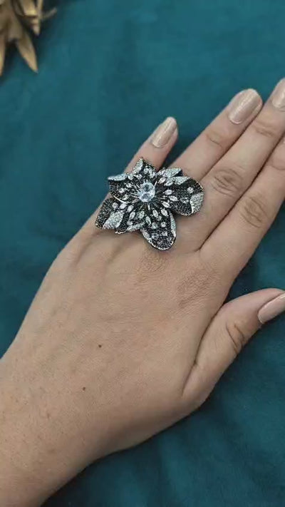 Vintage Inspired Victorian Black Polish Marquise Cubic Zircon Adjustable Big Flower Finger Ring