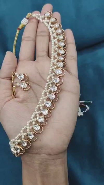White Moti With Kundan Drop Delicate Short Necklace Set
